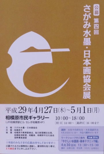 | さがみ水墨・日本画協会展プラス 第4回 2017年 さがみ墨彩会版 第4回さがみ水墨画・日本画協会展 2017年4月27日{木)~5月1日(月) 模原市民ギャラリー The 4th Exhibition of "SAGAMI Japanese Style Painting and Ink Painting Assosiation” |